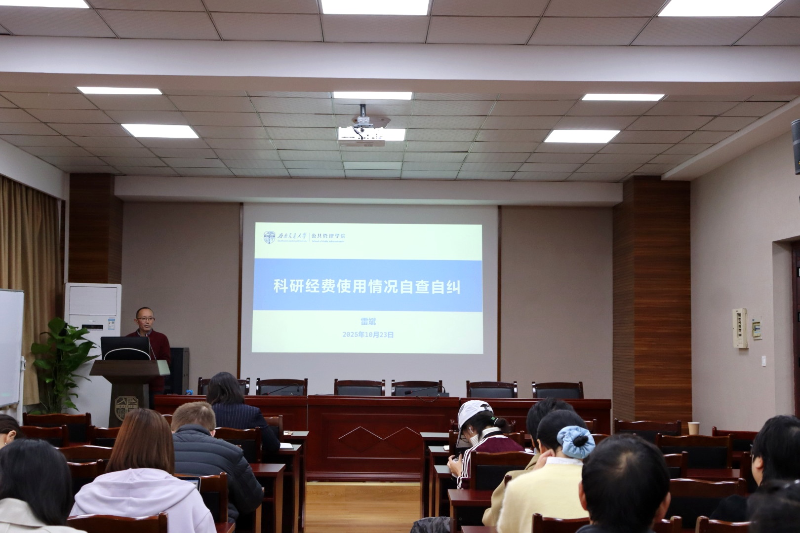 接着,学院副院长雷斌详细部署科研经费自查自纠专项工作,明确此次自查是落实教育部监管要求、提升经费使用效益的关键举措,核心目标是通过 “自我检视、主动整改” 的方式,确保科研经费使用全程合法合规、精准高效。雷斌围绕 11 项重点核查内容,重点强调要坚决杜绝与科研无关的支出、严厉防范虚构业务套取经费、严格规范学生劳务费发放等关键事项。他以 “违规报销学生返家差旅费”“借用学生银行卡套取经费” 等典型案例进行深刻警示,明确指出此类行为已涉嫌违规违法,必须坚决杜绝。同时,雷斌传达了学校关于科研经费监管的最新要求,强调科研经费全链条监管已实现无死角覆盖,高校绝非 “法外之地”。他特别提醒,11月5日前为自查整改的 “黄金窗口期”,鼓励教职工主动联系财务处调整经费使用方案或及时向学院报告问题,珍惜 “容错纠错” 的宝贵机会。