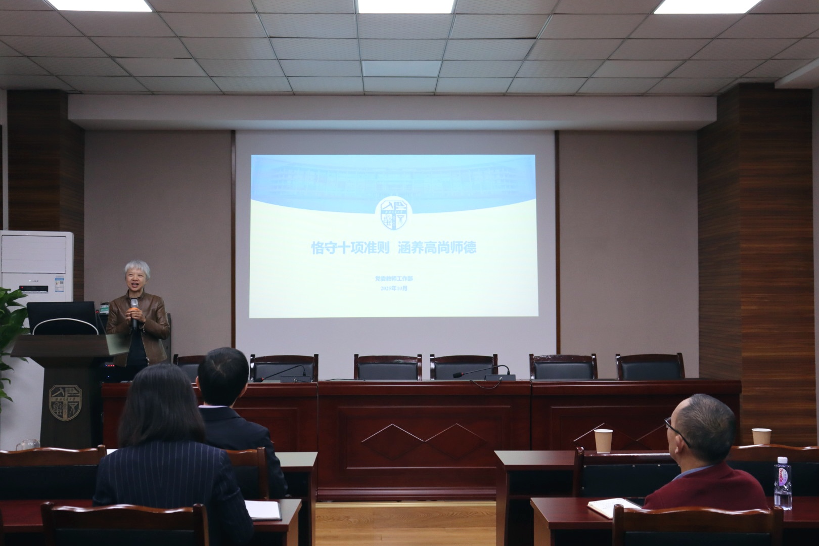 会议最后,学院党委书记高凡以 “坚守育人初心,涵养高尚师德” 为主题作专题讲座。她表示,此次内容既是响应学校师德师风建设的统一部署,也是对开学初专项学习的深化拓展,要求全体教职工将师德规范内化于心、外化于行。高凡书记结合《新时代高校教师职业行为十项准则》等重要文件,系统梳理学院师德师风建设的具体部署。她以教育部曝光的课堂言论不当、学术不端、滥用科研经费等典型案例为镜鉴,深入剖析违规行为的严重后果,明确指出违规者将面临取消评审资格、撤销教师资格甚至移送司法机关的严肃处理,同时还会对个人经济收入与退休待遇造成深远影响。